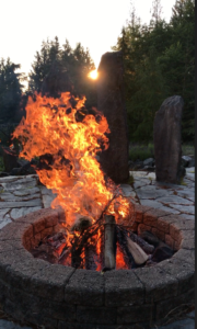We stumbled out of bed at 4:45am for the 5:07 sunrise. We lit the fire in the middle of the stone circle, grabbed the deck chairs and the dogs, and went out into the pre-dawn air. The moon was still up and to the east, a cloud bank hovered on the horizon. The Husband got the fire going — it’s like with the rocks, bigger is better. (See the video.)